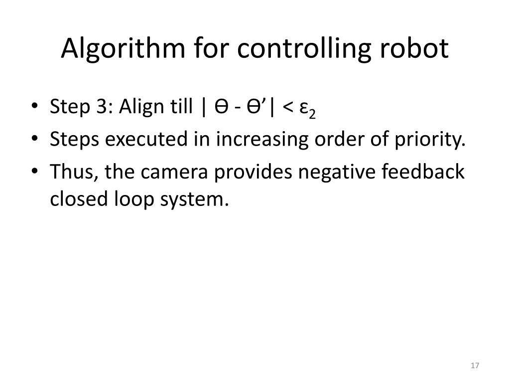 Algorithm for controlling robot • Step 3: Align till | Ɵ - Ɵ’| < ɛ2 • Steps executed in increasing order of priority. • Thus, the camera provides negative feedback closed loop system.