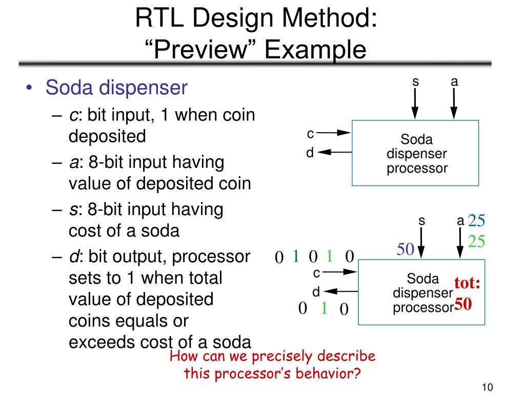 s a t ot_ld ld t ot t ot_clr clr 8 8 8 8-bit 8-bit t ot_lt_s adder < 8 D a tap a th Preview Example: Step 3 Connect Datapath to a Controller • Controller’s inputs • External input c (coin detected) • Input from datapath comparator’s output, which we named tot_lt_s • Controller’s outputs • External output d (dispense soda) • Outputs to datapath to load and clear the tot register s a 8 8 c d tot_ld tot_clr Controller Datapath tot_lt_s