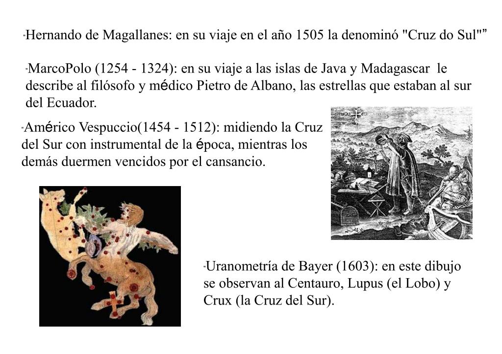 Hernando de Magallanes: en su viaje en el año 1505 la denominó "Cruz do Sul"” • MarcoPolo (1254 - 1324): en su viaje a las islas de Java y Madagascar le describe al filósofo y médico Pietro de Albano, las estrellas que estaban al sur del Ecuador. • Américo Vespuccio(1454 - 1512): midiendo la Cruz del Sur con instrumental de la época, mientras los demás duermen vencidos por el cansancio. • Uranometría de Bayer (1603): en este dibujo se observan al Centauro, Lupus (el Lobo) y Crux (la Cruz del Sur).