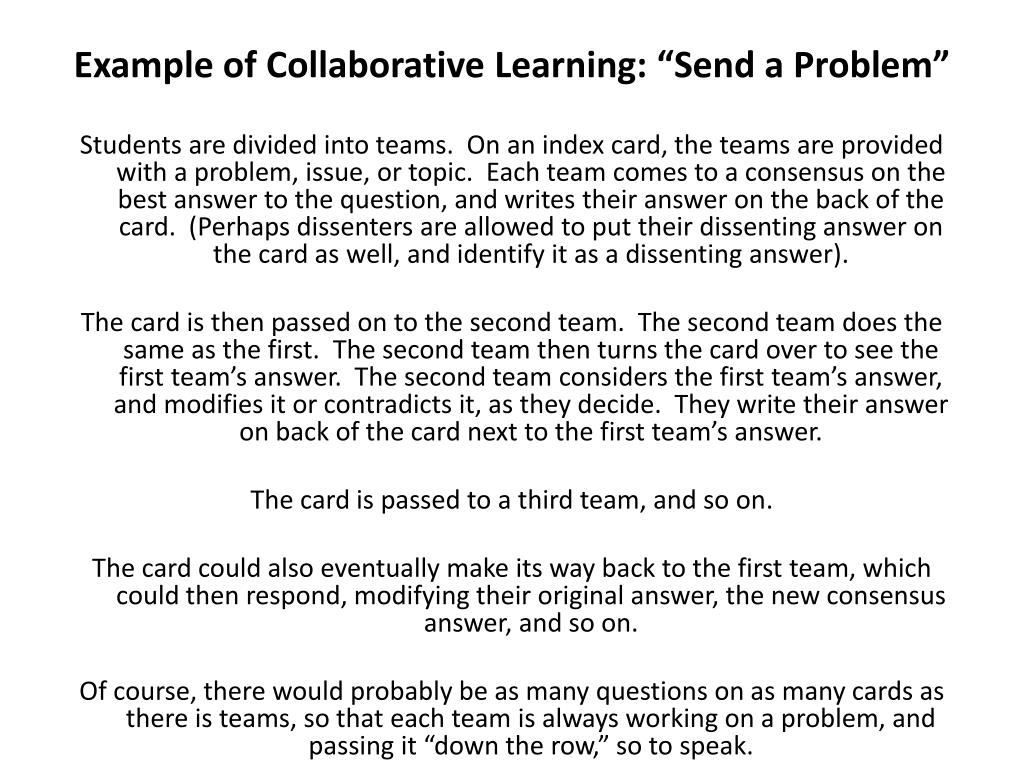 Example of Collaborative Learning: “Send a Problem” Students are divided into teams. On an index card, the teams are provided with a problem, issue, or topic. Each team comes to a consensus on the best answer to the question, and writes their answer on the back of the card. (Perhaps dissenters are allowed to put their dissenting answer on the card as well, and identify it as a dissenting answer). The card is then passed on to the second team. The second team does the same as the first. The second team then turns the card over to see the first team’s answer. The second team considers the first team’s answer, and modifies it or contradicts it, as they decide. They write their answer on back of the card next to the first team’s answer. The card is passed to a third team, and so on. The card could also eventually make its way back to the first team, which could then respond, modifying their original answer, the new consensus answer, and so on. Of course, there would probably be as many questions on as many cards as there is teams, so that each team is always working on a problem, and passing it “down the row,” so to speak.