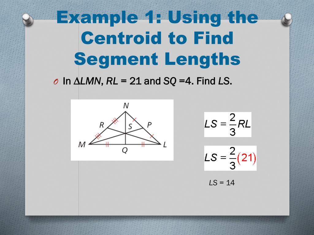 Example 1: Using the Centroid to Find Segment Lengths • In ∆LMN, RL = 21 and SQ =4. Find LS. LS = 14