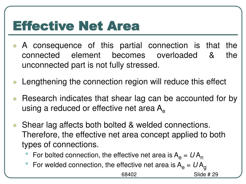 Effective Net Area • A consequence of this partial connection is that the connected element becomes overloaded & the unconnected part is not fully stressed. • Lengthening the connection region will reduce this effect • Research indicates that shear lag can be accounted for by using a reduced or effective net area Ae • Shear lag affects both bolted & welded connections. Therefore, the effective net area concept applied to both types of connections. • For bolted connection, the effective net area is Ae = U An • For welded connection, the effective net area is Ae = U Ag 68402