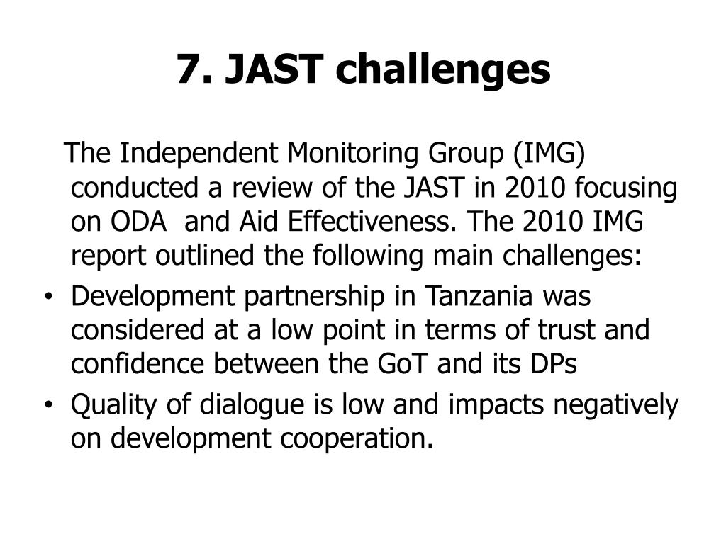7. JAST challenges The Independent Monitoring Group (IMG) conducted a review of the JAST in 2010 focusing on ODA and Aid Effectiveness. The 2010 IMG report outlined the following main challenges: • Development partnership in Tanzania was considered at a low point in terms of trust and confidence between the GoT and its DPs • Quality of dialogue is low and impacts negatively on development cooperation.