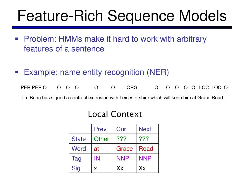 Feature-Rich Sequence Models • Problem: HMMs make it hard to work with arbitrary features of a sentence • Example: name entity recognition (NER) PER PER O O O O O O ORG O O O O O LOC LOC O Tim Boon has signed a contract extension with Leicestershire which will keep him at Grace Road . Local Context
