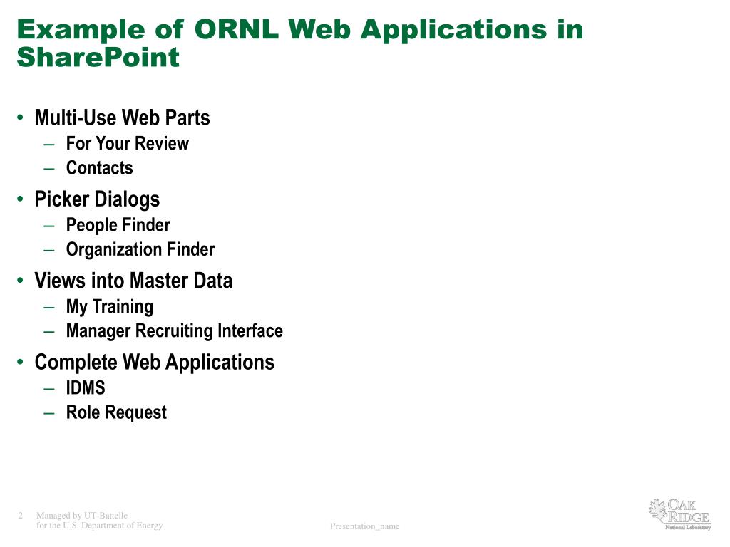 Example of ORNL Web Applications in SharePoint • Multi-Use Web Parts • For Your Review • Contacts • Picker Dialogs • People Finder • Organization Finder • Views into Master Data • My Training • Manager Recruiting Interface • Complete Web Applications • IDMS • Role Request
