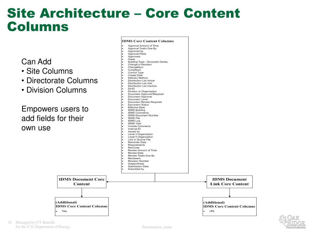 Site Architecture – Core Content Columns • Can Add • Site Columns • Directorate Columns • Division Columns • Empowers users to add fields for their own use