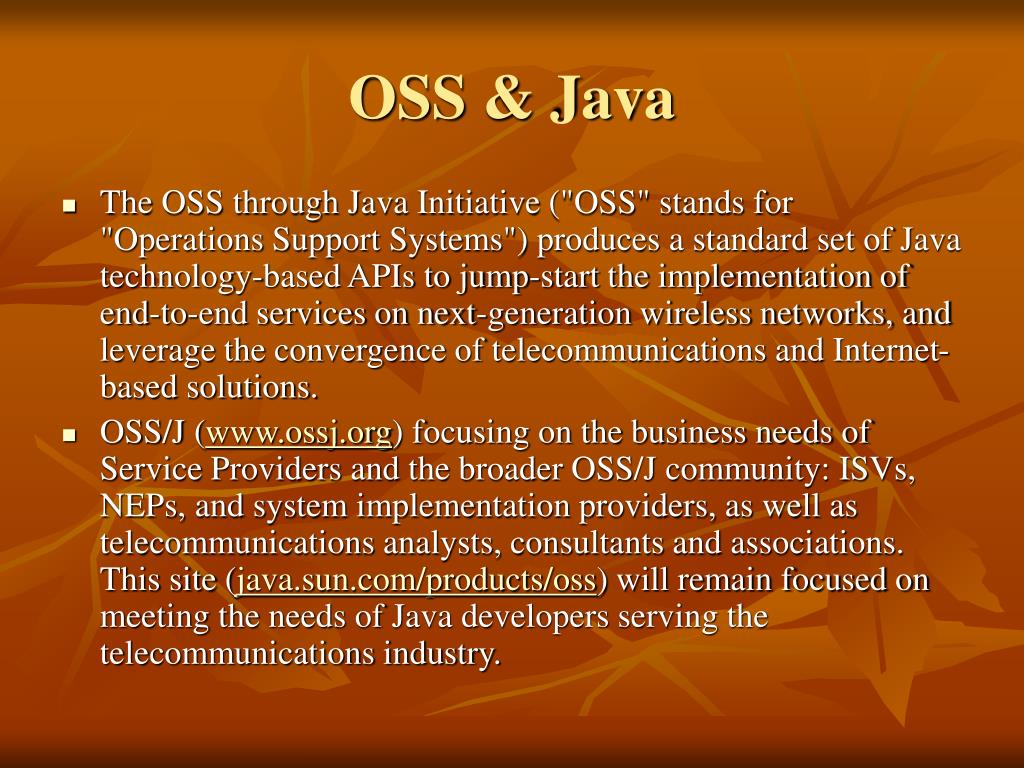 OSS & Java • The OSS through Java Initiative ("OSS" stands for "Operations Support Systems") produces a standard set of Java technology-based APIs to jump-start the implementation of end-to-end services on next-generation wireless networks, and leverage the convergence of telecommunications and Internet-based solutions. • OSS/J (www.ossj.org) focusing on the business needs of Service Providers and the broader OSS/J community: ISVs, NEPs, and system implementation providers, as well as telecommunications analysts, consultants and associations. This site (java.sun.com/products/oss) will remain focused on meeting the needs of Java developers serving the telecommunications industry.