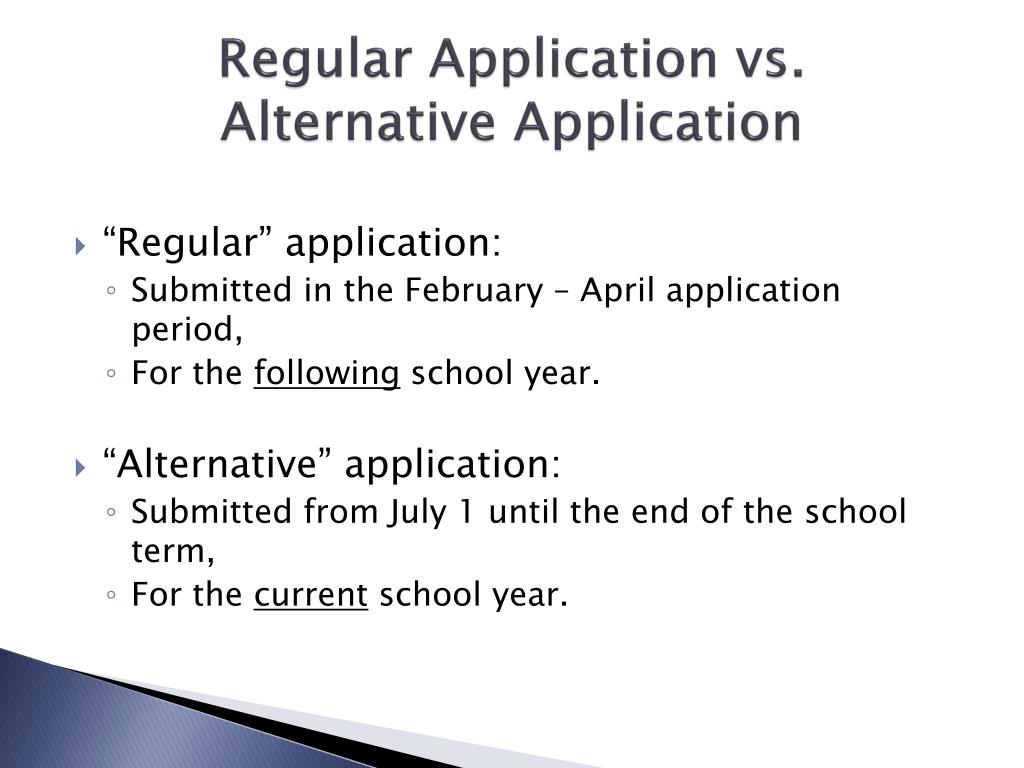 Regular Application vs. Alternative Application • “Regular” application: • Submitted in the February – April application period, • For the following school year. • “Alternative” application: • Submitted from July 1 until the end of the school term, • For the current school year.