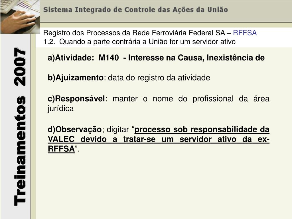 Atividade: M140 - Interesse na Causa, Inexistência de Ajuizamento: data do registro da atividade Responsável: manter o nome do profissional da área jurídica Observação; digitar “processo sob responsabilidade da VALEC devido a tratar-se um servidor ativo da ex-RFFSA”. Registro dos Processos da Rede Ferroviária Federal SA – RFFSA 1.2. Quando a parte contrária a União for um servidor ativo