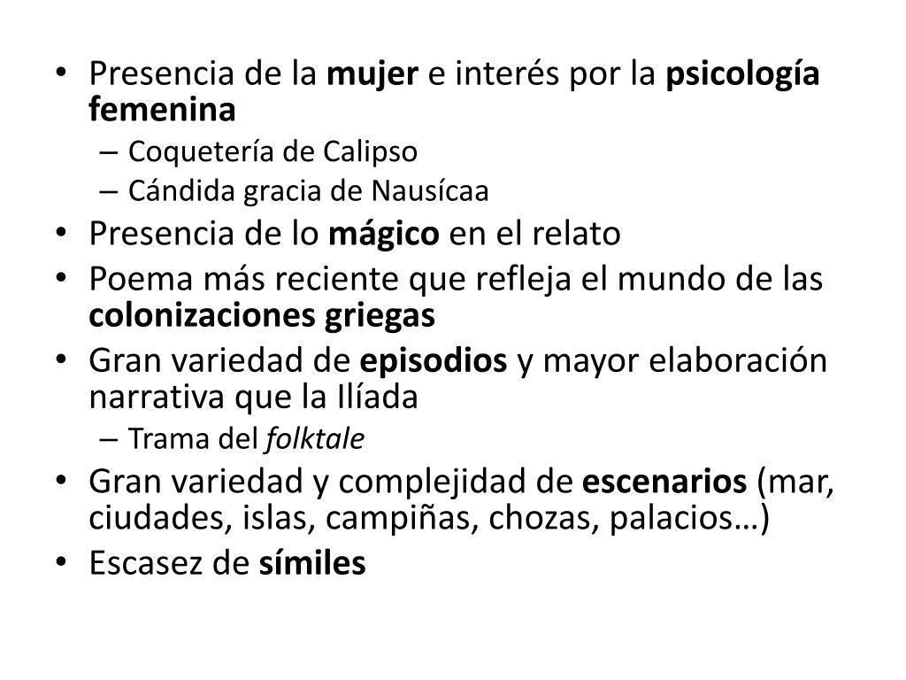 Presencia de la mujer e interés por la psicología femenina • Coquetería de Calipso • Cándida gracia de Nausícaa • Presencia de lo mágico en el relato • Poema más reciente que refleja el mundo de las colonizaciones griegas • Gran variedad de episodios y mayor elaboración narrativa que la Ilíada • Trama del folktale • Gran variedad y complejidad de escenarios (mar, ciudades, islas, campiñas, chozas, palacios…) • Escasez de símiles