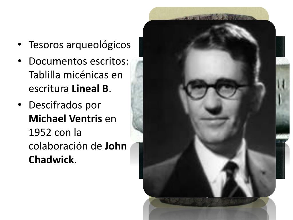Tesoros arqueológicos • Documentos escritos: Tablilla micénicas en escritura Lineal B. • Descifrados por Michael Ventrisen 1952 con la colaboración de John Chadwick.