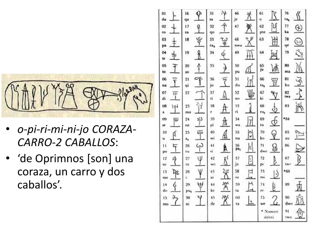 o-pi-ri-mi-ni-jo CORAZA-CARRO-2 CABALLOS: • ‘de Oprimnos [son] una coraza, un carro y dos caballos’.