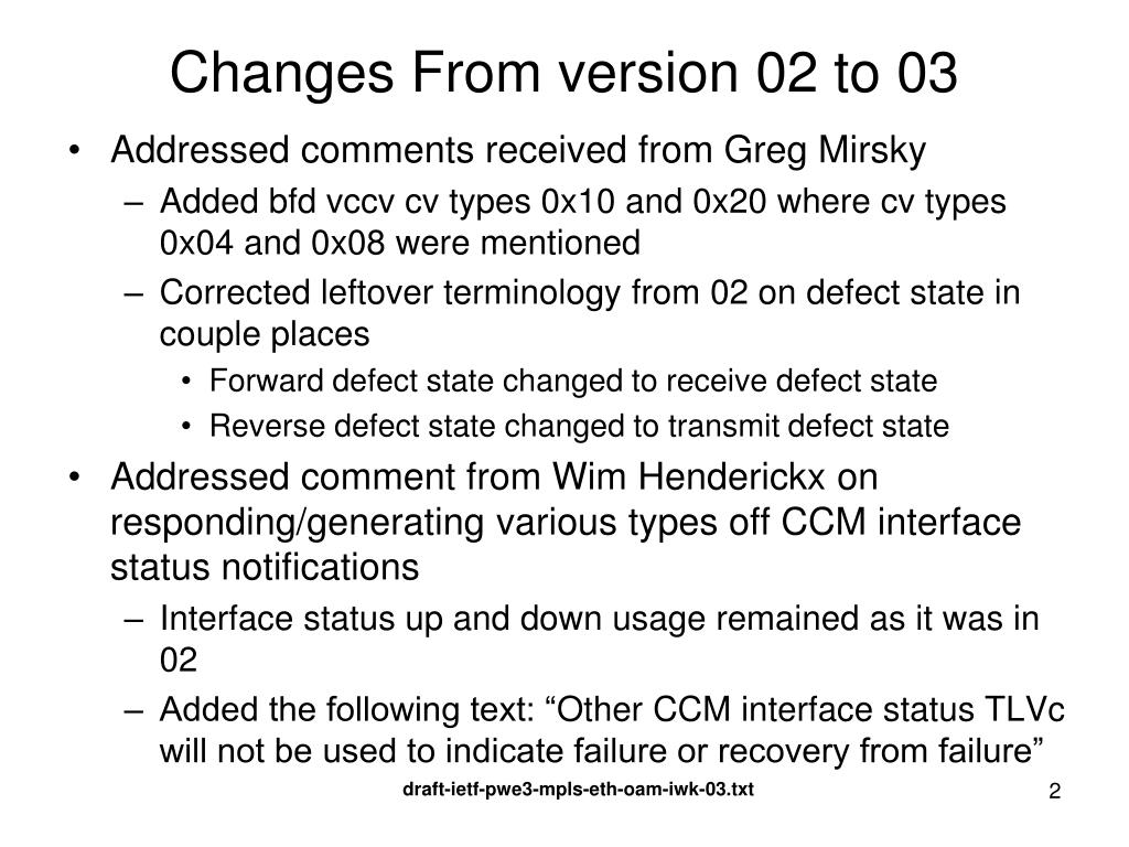 Changes From version 02 to 03 • Addressed comments received from Greg Mirsky • Added bfd vccv cv types 0x10 and 0x20 where cv types 0x04 and 0x08 were mentioned • Corrected leftover terminology from 02 on defect state in couple places • Forward defect state changed to receive defect state • Reverse defect state changed to transmit defect state • Addressed comment from Wim Henderickx on responding/generating various types off CCM interface status notifications • Interface status up and down usage remained as it was in 02 • Added the following text: “Other CCM interface status TLVc will not be used to indicate failure or recovery from failure” draft-ietf-pwe3-mpls-eth-oam-iwk-03.txt