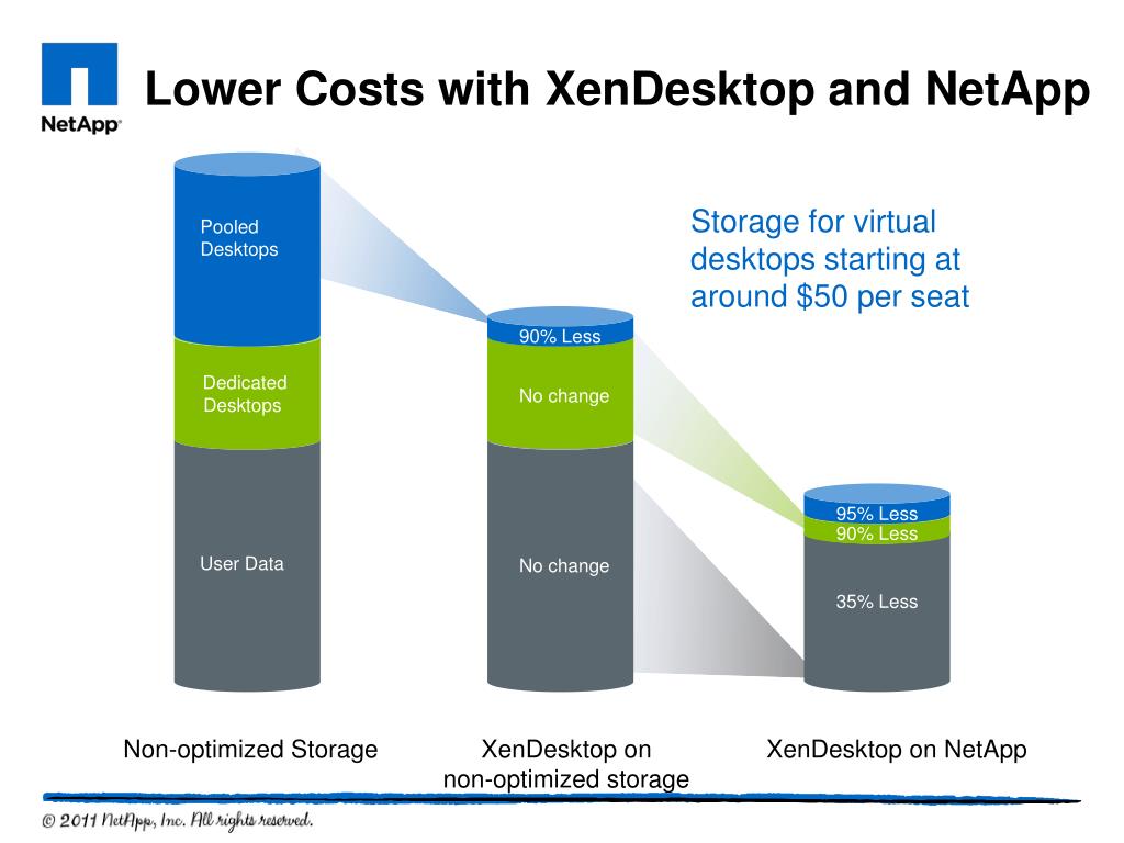 Lower Costs with XenDesktop and NetApp Pooled Desktops Dedicated Desktops User Data Storage for virtual desktops starting at around $50 per seat 90% Less No change 95% Less 90% Less No change 35% Less Non-optimized Storage XenDesktop on non-optimized storage XenDesktopon NetApp
