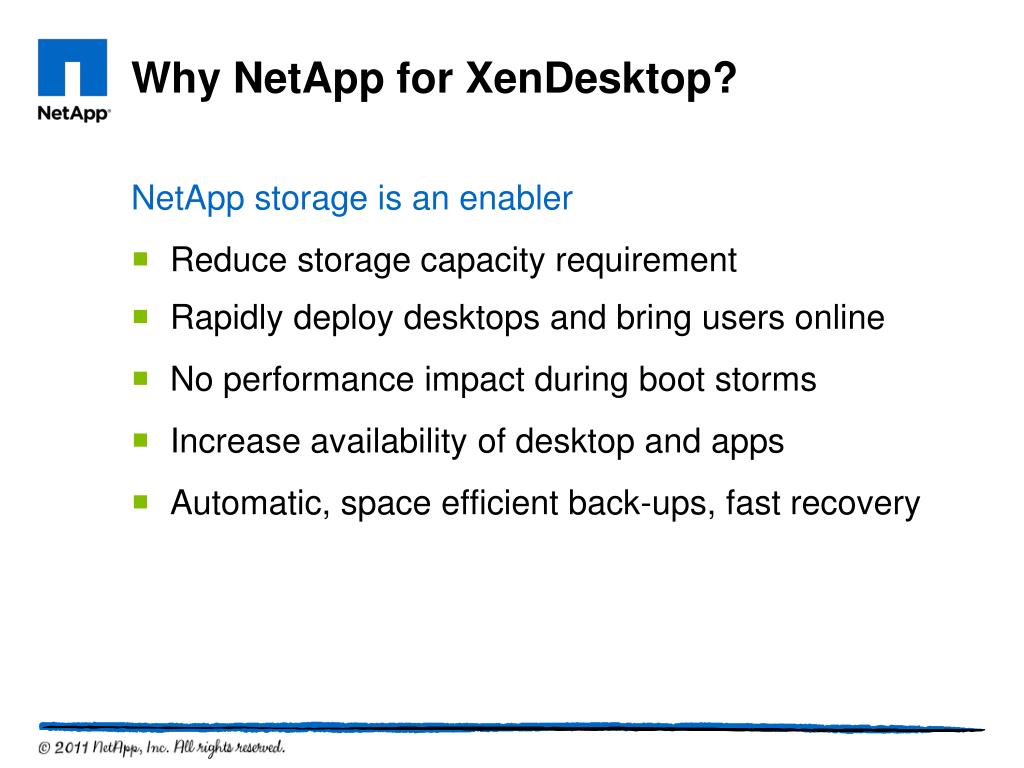 Why NetApp for XenDesktop? • NetApp storage is an enabler • Reduce storage capacity requirement • Rapidly deploy desktops and bring users online • No performance impact during boot storms • Increase availability of desktop and apps • Automatic, space efficient back-ups, fast recovery