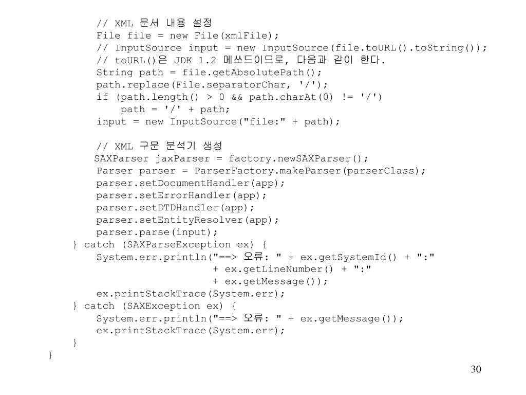 // XML 문서 내용 설정 File file = new File(xmlFile); // InputSource input = new InputSource(file.toURL().toString()); // toURL()은 JDK 1.2 메쏘드이므로, 다음과 같이 한다. String path = file.getAbsolutePath(); path.replace(File.separatorChar, '/'); if (path.length() > 0 && path.charAt(0) != '/') path = '/' + path; input = new InputSource("file:" + path); // XML 구문 분석기 생성 SAXParser jaxParser = factory.newSAXParser(); Parser parser = ParserFactory.makeParser(parserClass); parser.setDocumentHandler(app); parser.setErrorHandler(app); parser.setDTDHandler(app); parser.setEntityResolver(app); parser.parse(input); } catch (SAXParseException ex) { System.err.println("==> 오류: " + ex.getSystemId() + ":" + ex.getLineNumber() + ":" + ex.getMessage()); ex.printStackTrace(System.err); } catch (SAXException ex) { System.err.println("==> 오류: " + ex.getMessage()); ex.printStackTrace(System.err); } }