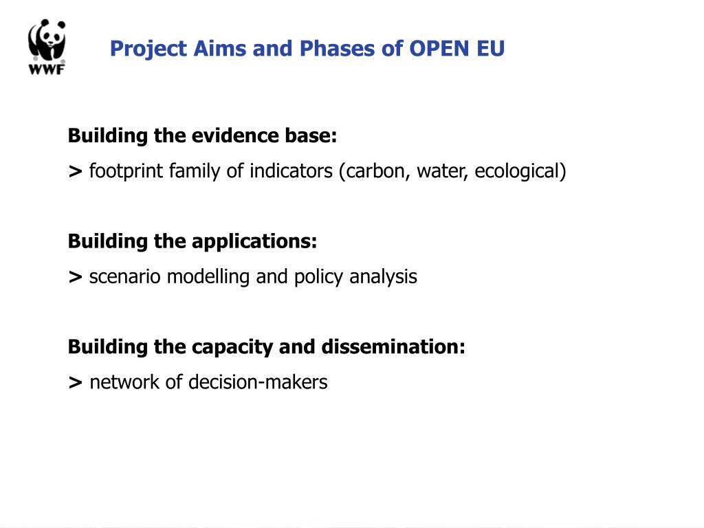 Project Aims and Phases of OPEN EU Building the evidence base: > footprint family of indicators (carbon, water, ecological) Building the applications: > scenario modelling and policy analysis Building the capacity and dissemination: > network of decision-makers