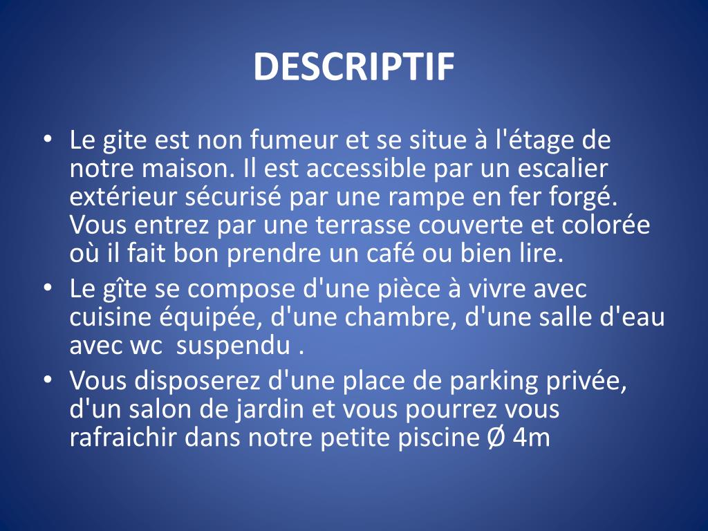 DESCRIPTIF • Le gite est non fumeur et se situe à l'étage de notre maison. Il est accessible par un escalier extérieur sécurisé par une rampe en fer forgé. Vous entrez par une terrasse couverte et colorée où il fait bon prendre un café ou bien lire. • Le gîte se compose d'une pièce à vivre avec cuisine équipée, d'une chambre, d'une salle d'eau avec wc suspendu . • Vous disposerez d'une place de parking privée, d'un salon de jardin et vous pourrez vous rafraichir dans notre petite piscine Ø 4m