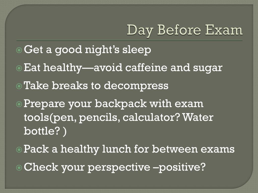 Day Before Exam Get a good night’s sleep Eat healthy—avoid caffeine and sugar Take breaks to decompress Prepare your backpack with exam tools(pen, pencils, calculator? Water bottle? ) Pack a healthy lunch for between exams Check your perspective –positive?