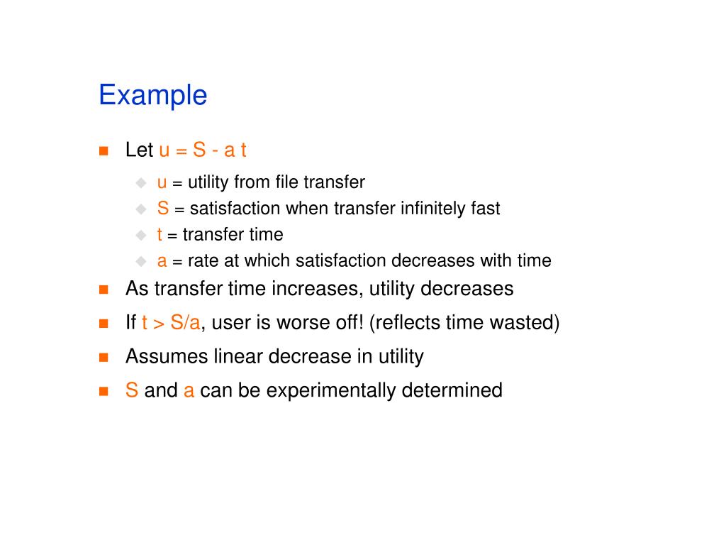 Example • Let u = S - a t • u = utility from file transfer • S = satisfaction when transfer infinitely fast • t = transfer time • a = rate at which satisfaction decreases with time • As transfer time increases, utility decreases • If t > S/a, user is worse off! (reflects time wasted) • Assumes linear decrease in utility • S and a can be experimentally determined