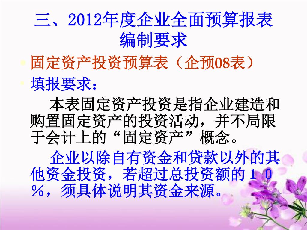 三、2012年度企业全面预算报表编制要求 固定资产投资预算表(企预08表) 填报要求: 本表固定资产投资是指企业建造和购置固定资产的投资活动,并不局限于会计上的“固定资产”概念。 企业以除自有资金和贷款以外的其他资金投资,若超过总投资额的10%,须具体说明其资金来源。