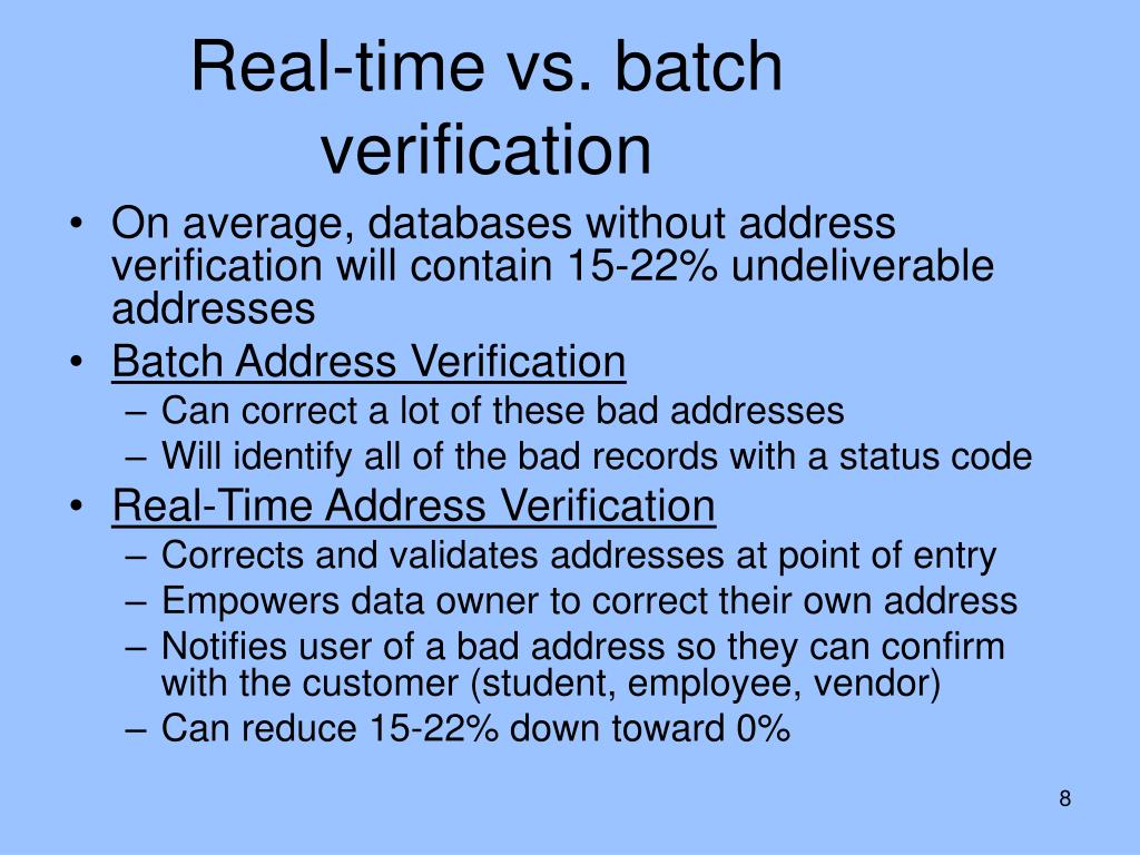 Real-time vs. batch verification • On average, databases without address verification will contain 15-22% undeliverable addresses • Batch Address Verification • Can correct a lot of these bad addresses • Will identify all of the bad records with a status code • Real-Time Address Verification • Corrects and validates addresses at point of entry • Empowers data owner to correct their own address • Notifies user of a bad address so they can confirm with the customer (student, employee, vendor) • Can reduce 15-22% down toward 0%