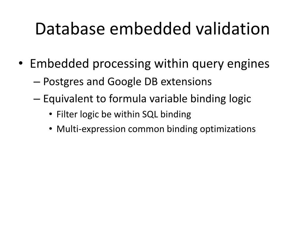 Database embedded validation • Embedded processing within query engines • Postgres and Google DB extensions • Equivalent to formula variable binding logic • Filter logic be within SQL binding • Multi-expression common binding optimizations