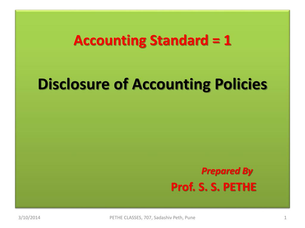 Accounting Standard = 1 Disclosure of Accounting Policies Prepared By Prof. S. S. PETHE PETHE CLASSES, 707, Sadashiv Peth, Pune