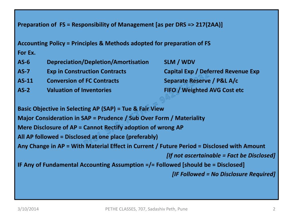 Preparation of FS = Responsibility of Management [as per DRS => 217(2AA)] Accounting Policy = Principles & Methods adopted for preparation of FS For Ex. AS-6 Depreciation/Depletion/Amortisation SLM / WDV AS-7 Exp in Construction Contracts Capital Exp / Deferred Revenue Exp AS-11 Conversion of FC Contracts Separate Reserve / P&L A/c AS-2 Valuation of Inventories FIFO / Weighted AVG Cost etc Basic Objective in Selecting AP (SAP) = Tue & Fair View Major Consideration in SAP = Prudence / Sub Over Form / Materiality Mere Disclosure of AP = Cannot Rectify adoption of wrong AP All AP followed = Disclosed at one place (preferably) Any Change in AP = With Material Effect in Current / Future Period = Disclosed with Amount [If not ascertainable = Fact be Disclosed] IF Any of Fundamental Accounting Assumption =/= Followed [should be = Disclosed] [IF Followed = No Disclosure Required] PETHE CLASSES, 707, Sadashiv Peth, Pune