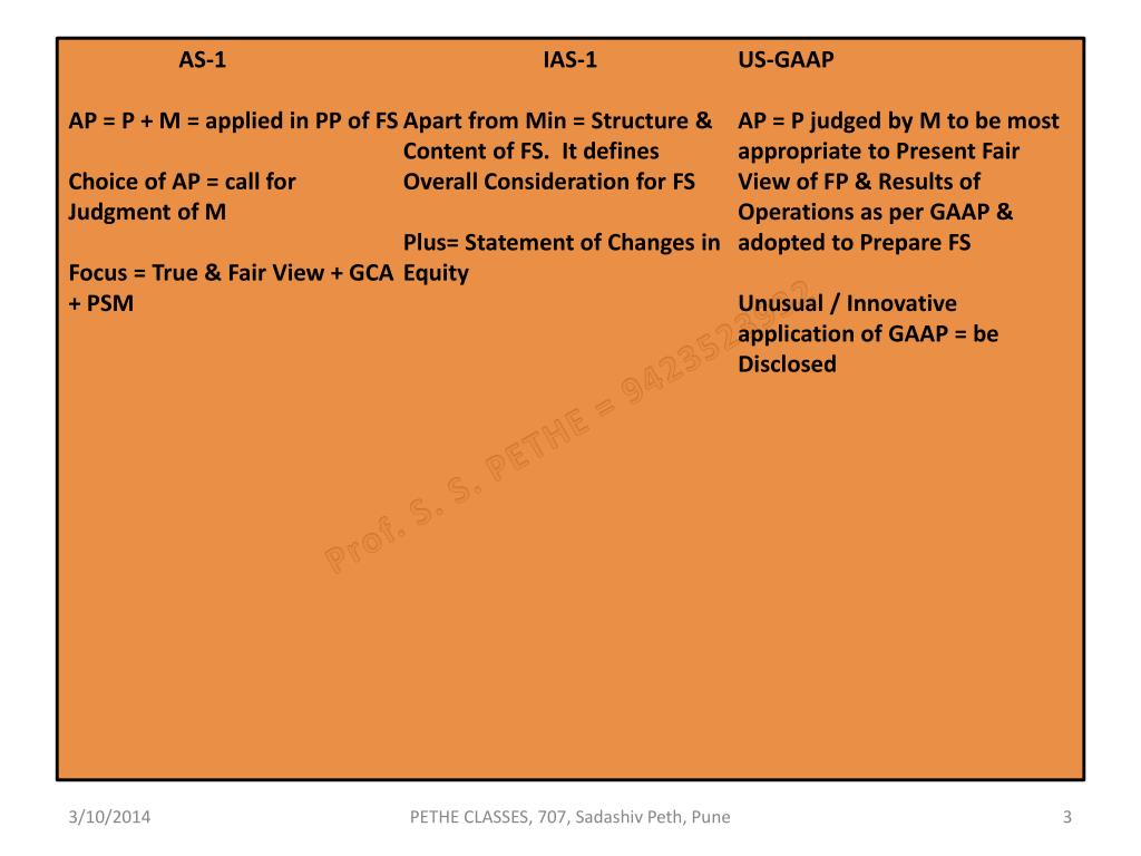 AS-1 AP = P + M = applied in PP of FS Choice of AP = call for Judgment of M Focus = True & Fair View + GCA + PSM IAS-1 Apart from Min = Structure & Content of FS. It defines Overall Consideration for FS Plus= Statement of Changes in Equity US-GAAP AP = P judged by M to be most appropriate to Present Fair View of FP & Results of Operations as per GAAP & adopted to Prepare FS Unusual / Innovative application of GAAP = be Disclosed PETHE CLASSES, 707, Sadashiv Peth, Pune