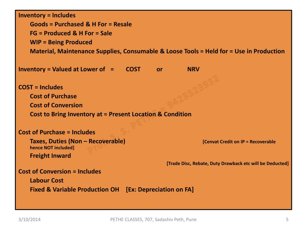 Inventory = Includes Goods = Purchased & H For = Resale FG = Produced & H For = Sale WIP = Being Produced Material, Maintenance Supplies, Consumable & Loose Tools = Held for = Use in Production Inventory = Valued at Lower of = COST or NRV COST = Includes Cost of Purchase Cost of Conversion Cost to Bring Inventory at = Present Location & Condition Cost of Purchase = Includes Taxes, Duties (Non – Recoverable) [Cenvat Credit on IP = Recoverable hence NOT included] Freight Inward [Trade Disc, Rebate, Duty Drawback etc will be Deducted] Cost of Conversion = Includes Labour Cost Fixed & Variable Production OH [Ex: Depreciation on FA] PETHE CLASSES, 707, Sadashiv Peth, Pune