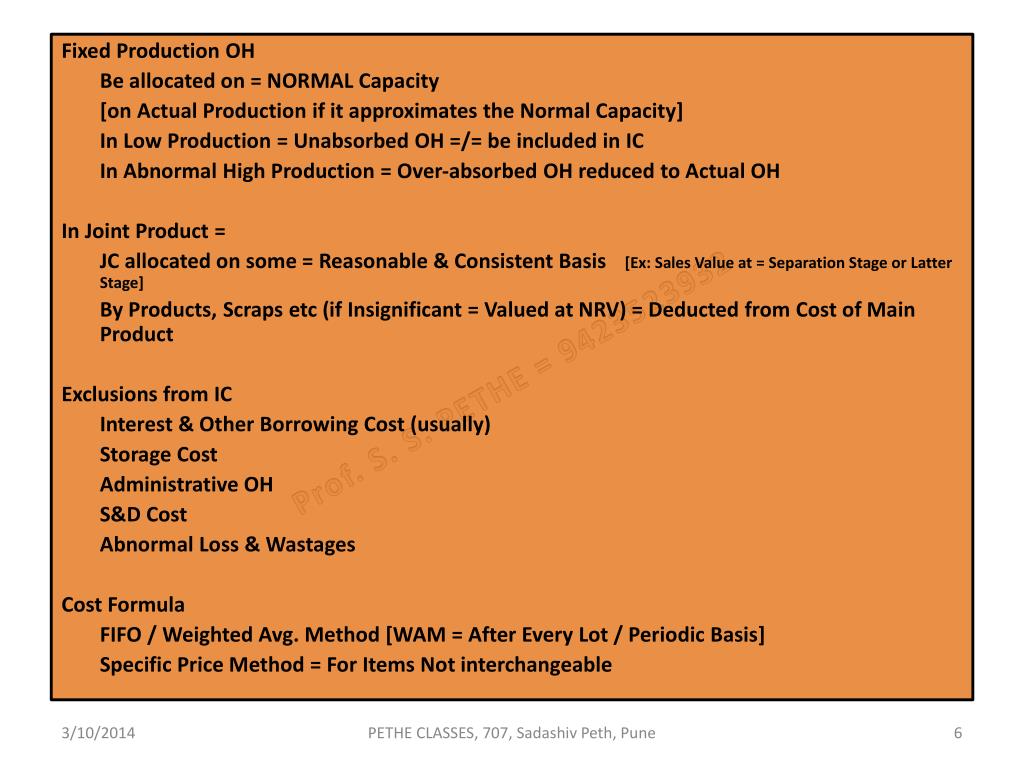 Fixed Production OH Be allocated on = NORMAL Capacity [on Actual Production if it approximates the Normal Capacity] In Low Production = Unabsorbed OH =/= be included in IC In Abnormal High Production = Over-absorbed OH reduced to Actual OH In Joint Product = JC allocated on some = Reasonable & Consistent Basis [Ex: Sales Value at = Separation Stage or Latter Stage] By Products, Scraps etc (if Insignificant = Valued at NRV) = Deducted from Cost of Main Product Exclusions from IC Interest & Other Borrowing Cost (usually) Storage Cost Administrative OH S&D Cost Abnormal Loss & Wastages Cost Formula FIFO / Weighted Avg. Method [WAM = After Every Lot / Periodic Basis] Specific Price Method = For Items Not interchangeable PETHE CLASSES, 707, Sadashiv Peth, Pune
