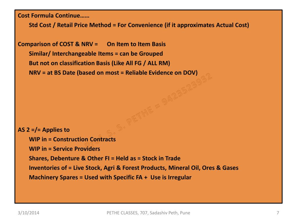 Cost Formula Continue…… Std Cost / Retail Price Method = For Convenience (if it approximates Actual Cost) Comparison of COST & NRV = On Item to Item Basis Similar/ Interchangeable Items = can be Grouped But not on classification Basis (Like All FG / ALL RM) NRV = at BS Date (based on most = Reliable Evidence on DOV) AS 2 =/= Applies to WIP in = Construction Contracts WIP in = Service Providers Shares, Debenture & Other FI = Held as = Stock in Trade Inventories of = Live Stock, Agri & Forest Products, Mineral Oil, Ores & Gases Machinery Spares = Used with Specific FA + Use is Irregular PETHE CLASSES, 707, Sadashiv Peth, Pune