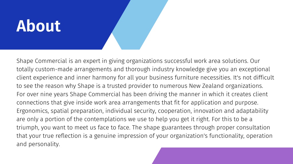 About Shape Commercial is an expert in giving organizations successful work area solutions. Our totally custom-made arrangements and thorough industry knowledge give you an exceptional client experience and inner harmony for all your business furniture necessities. It's not difficult to see the reason why Shape is a trusted provider to numerous New Zealand organizations. For over nine years Shape Commercial has been driving the manner in which it creates client connections that give inside work area arrangements that fit for application and purpose. Ergonomics, spatial preparation, individual security, cooperation, innovation and adaptability are only a portion of the contemplations we use to help you get it right. For this to be a triumph, you want to meet us face to face. The shape guarantees through proper consultation that your true reflection is a genuine impression of your organization's functionality, operation and personality.