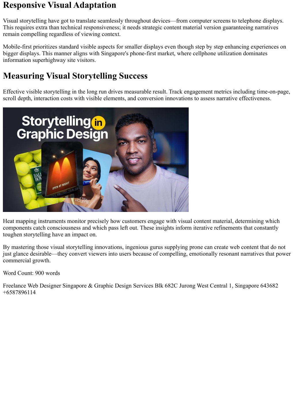 Responsive Visual Adaptation Visual storytelling have got to translate seamlessly throughout devices—from computer screens to telephone displays. This requires extra than technical responsiveness; it needs strategic content material version guaranteeing narratives remain compelling regardless of viewing context. Mobile-first prioritizes standard visible aspects for smaller displays even though step by step enhancing experiences on bigger displays. This manner aligns with Singapore's phone-first market, where cellphone utilization dominates information superhighway site visitors. Measuring Visual Storytelling Success Effective visible storytelling in the long run drives measurable result. Track engagement metrics including time-on-page, scroll depth, interaction costs with visible elements, and conversion innovations to assess narrative effectiveness. Heat mapping instruments monitor precisely how customers engage with visual content material, determining which components catch consciousness and which pass left out. These insights inform iterative refinements that constantly toughen storytelling have an impact on. By mastering those visual storytelling innovations, ingenious gurus supplying prone can create web content that do not just glance desirable—they convert viewers into users because of compelling, emotionally resonant narratives that power commercial growth. Word Count: 900 words Freelance Web Designer Singapore & Graphic Design Services Blk 682C Jurong West Central 1, Singapore 643682 +6587896114