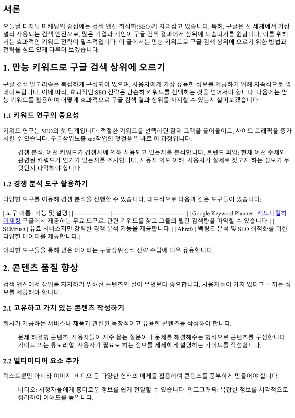 1. 서론 오늘날디지털마케팅의중심에는검색엔진최적화(SEO)가자리잡고있습니다. 특히, 구글은전세계에서가장 널리사용되는검색엔진으로, 많은기업과개인이구글검색결과에서상위에노출되기를원합니다. 이를위해 서는효과적인키워드전략이필수적입니다. 이글에서는만능키워드로구글검색상위에오르기위한방법과 전략을심도있게다루어보겠습니다. 1. 만능키워드로구글검색상위에오르기 구글검색알고리즘은복잡하게구성되어있으며, 사용자에게가장유용한정보를제공하기위해지속적으로업 데이트됩니다. 이에따라, 효과적인 SEO 전략은단순히키워드를선택하는것을넘어서야합니다. 다음에는만 능키워드를활용하여어떻게효과적으로구글검색결과상위를차지할수있는지살펴보겠습니다. 1.1 키워드연구의중요성 키워드연구는 SEO의첫단계입니다. 적절한키워드를선택하면잠재고객을끌어들이고, 사이트트래픽을증가 시킬수있습니다. 구글상위노출 seo작업의첫걸음은바로이과정입니다. 경쟁분석: 어떤키워드가경쟁사에의해사용되고있는지를분석합니다. 트렌드파악: 현재어떤주제와 관련된키워드가인기가있는지를조사합니다. 사용자의도이해: 사용자가실제로찾고자하는정보가무 엇인지파악해야합니다. 1.2 경쟁분석도구활용하기 다양한도구를이용해경쟁분석을진행할수있습니다. 대표적으로다음과같은도구들이있습니다: | 도구이름 | 기능및설명 | |-------------------|--------------------------------------| | Google Keyword Planner | 캐노니컬하 이재킹구글에서제공하는무료도구로, 관련키워드를찾고그들의월간검색량을파악할수있습니다. | | SEMrush | 유료서비스지만강력한경쟁분석기능을제공합니다. | | Ahrefs | 백링크분석및 SEO 최적화를위한 다양한데이터를제공합니다.| 이러한도구들을통해얻은데이터는구글상위검색전략수립에매우유용합니다. 2. 콘텐츠품질향상 검색엔진에서상위를차지하기위해선콘텐츠의질이무엇보다중요합니다. 사용자들이가치있다고느끼는정 보를제공해야합니다. 2.1 고유하고가치있는콘텐츠작성하기 회사가제공하는서비스나제품과관련된독창적이고유용한콘텐츠를작성해야합니다. 문제해결형콘텐츠: 사용자들이자주묻는질문이나문제를해결해주는형식으로콘텐츠를구성합니다. 가이드또는튜토리얼: 사용자가필요로하는정보를세세하게설명하는가이드를작성합니다. 2.2 멀티미디어요소추가 텍스트뿐만아니라이미지, 비디오등다양한형태의매체를활용하여콘텐츠를풍부하게만들어야합니다. 비디오: 시청자들에게흥미로운정보를쉽게전달할수있습니다. 인포그래픽: 복잡한정보를시각적으로 정리하여이해도를높입니다.