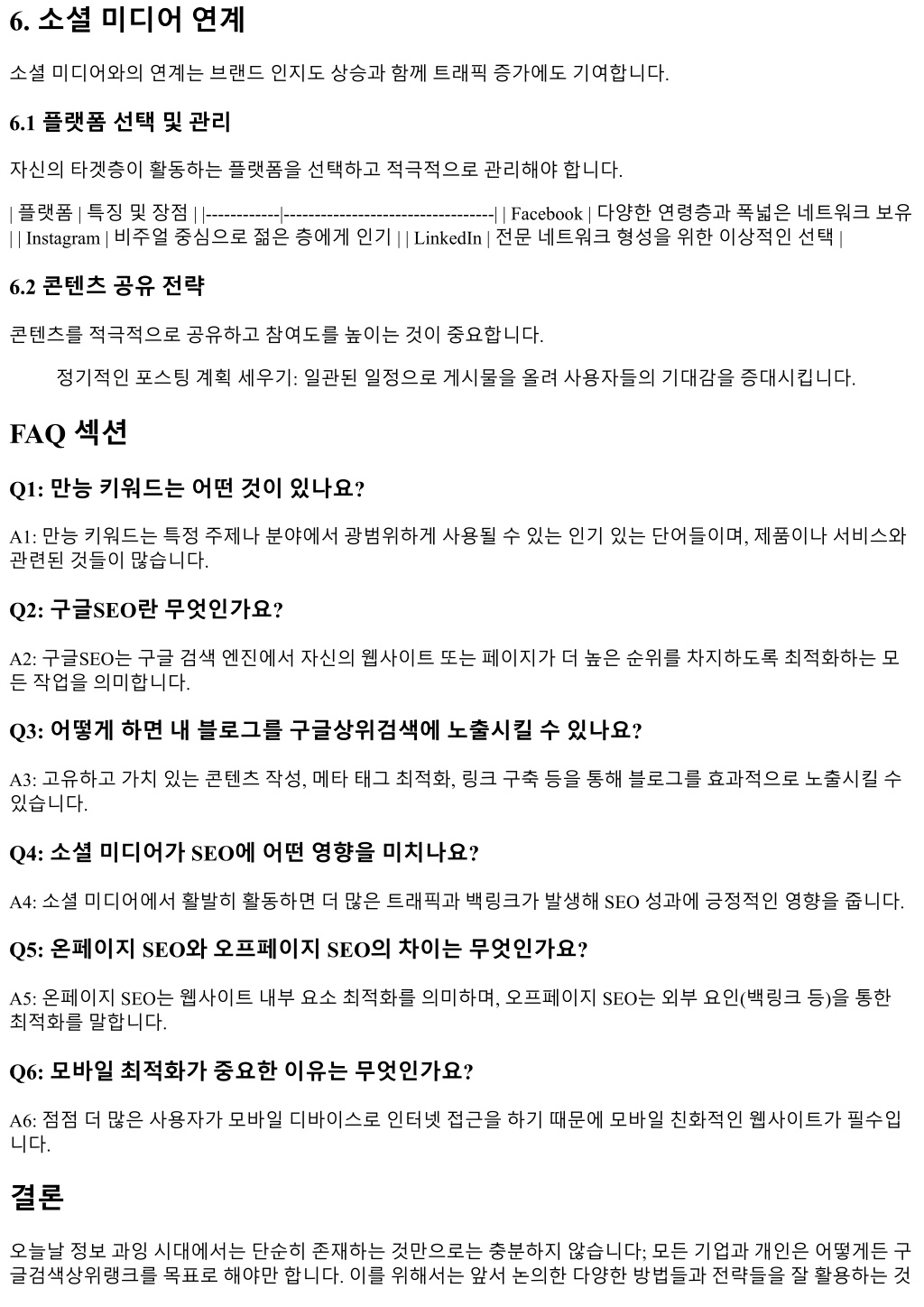 3. 6. 소셜미디어연계 소셜미디어와의연계는브랜드인지도상승과함께트래픽증가에도기여합니다. 6.1 플랫폼선택및관리 자신의타겟층이활동하는플랫폼을선택하고적극적으로관리해야합니다. | 플랫폼 | 특징및장점 | |------------|----------------------------------| | Facebook | 다양한연령층과폭넓은네트워크보유 | | Instagram | 비주얼중심으로젊은층에게인기 | | LinkedIn | 전문네트워크형성을위한이상적인선택 | 6.2 콘텐츠공유전략 콘텐츠를적극적으로공유하고참여도를높이는것이중요합니다. 정기적인포스팅계획세우기: 일관된일정으로게시물을올려사용자들의기대감을증대시킵니다. FAQ 섹션 Q1: 만능키워드는어떤것이있나요? A1: 만능키워드는특정주제나분야에서광범위하게사용될수있는인기있는단어들이며, 제품이나서비스와 관련된것들이많습니다. Q2: 구글SEO란무엇인가요? A2: 구글SEO는구글검색엔진에서자신의웹사이트또는페이지가더높은순위를차지하도록최적화하는모 든작업을의미합니다. Q3: 어떻게하면내블로그를구글상위검색에노출시킬수있나요? A3: 고유하고가치있는콘텐츠작성, 메타태그최적화, 링크구축등을통해블로그를효과적으로노출시킬수 있습니다. Q4: 소셜미디어가 SEO에어떤영향을미치나요? A4: 소셜미디어에서활발히활동하면더많은트래픽과백링크가발생해 SEO 성과에긍정적인영향을줍니다. Q5: 온페이지 SEO와오프페이지 SEO의차이는무엇인가요? A5: 온페이지 SEO는웹사이트내부요소최적화를의미하며, 오프페이지 SEO는외부요인(백링크등)을통한 최적화를말합니다. Q6: 모바일최적화가중요한이유는무엇인가요? A6: 점점더많은사용자가모바일디바이스로인터넷접근을하기때문에모바일친화적인웹사이트가필수입 니다. 결론 오늘날정보과잉시대에서는단순히존재하는것만으로는충분하지않습니다; 모든기업과개인은어떻게든구 글검색상위랭크를목표로해야만합니다. 이를위해서는앞서논의한다양한방법들과전략들을잘활용하는것