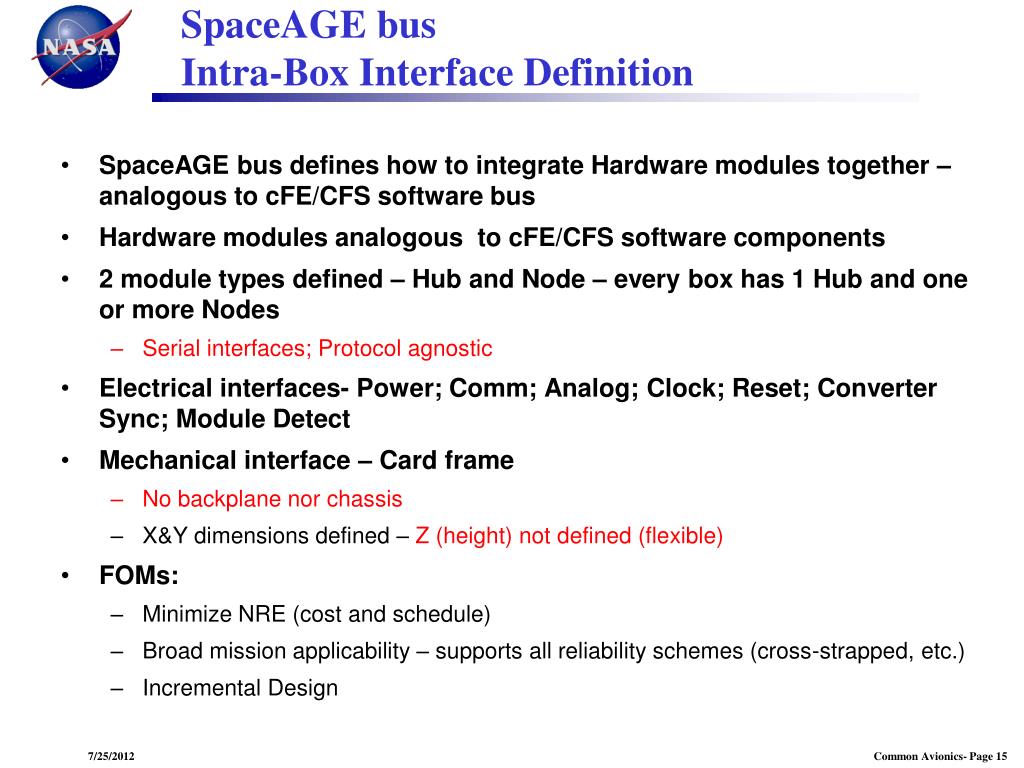SpaceAGE busIntra-Box Interface Definition • SpaceAGE bus defines how to integrate Hardware modules together – analogous to cFE/CFS software bus • Hardware modules analogous to cFE/CFS software components • 2 module types defined – Hub and Node – every box has 1 Hub and one or more Nodes • Serial interfaces; Protocol agnostic • Electrical interfaces- Power; Comm; Analog; Clock; Reset; Converter Sync; Module Detect • Mechanical interface – Card frame • No backplane nor chassis • X&Y dimensions defined – Z (height) not defined (flexible) • FOMs: • Minimize NRE (cost and schedule) • Broad mission applicability – supports all reliability schemes (cross-strapped, etc.) • Incremental Design