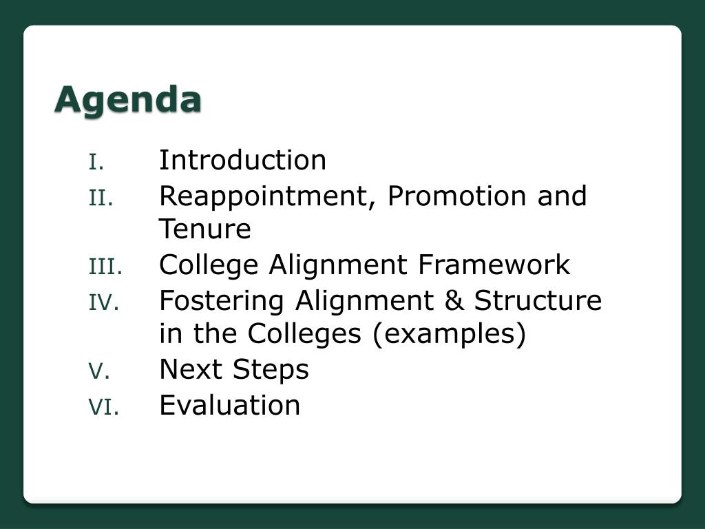 Agenda • Introduction • Reappointment, Promotion and Tenure • College Alignment Framework • Fostering Alignment & Structure in the Colleges (examples) • Next Steps • Evaluation