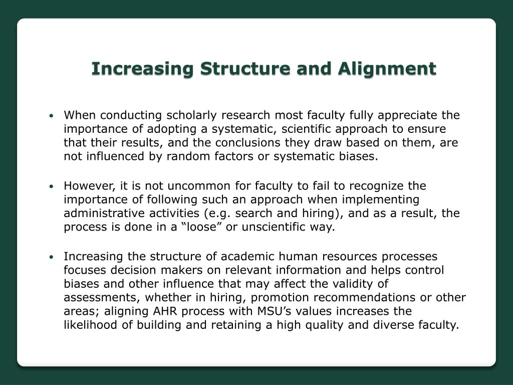 Increasing Structure and Alignment When conducting scholarly research most faculty fully appreciate the importance of adopting a systematic, scientific approach to ensure that their results, and the conclusions they draw based on them, are not influenced by random factors or systematic biases. However, it is not uncommon for faculty to fail to recognize the importance of following such an approach when implementing administrative activities (e.g. search and hiring), and as a result, the process is done in a “loose” or unscientific way. Increasing the structure of academic human resources processes focuses decision makers on relevant information and helps control biases and other influence that may affect the validity of assessments, whether in hiring, promotion recommendations or other areas; aligning AHR process with MSU’s values increases the likelihood of building and retaining a high quality and diverse faculty.