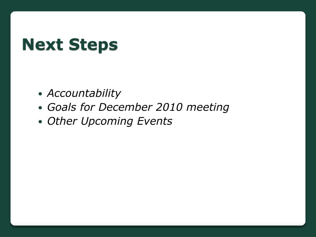 Next Steps • Accountability • Goals for December 2010 meeting • Other Upcoming Events