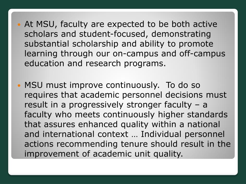 At MSU, faculty are expected to be both active scholars and student-focused, demonstrating substantial scholarship and ability to promote learning through our on-campus and off-campus education and research programs. • MSU must improve continuously. To do so requires that academic personnel decisions must result in a progressively stronger faculty – a faculty who meets continuously higher standards that assures enhanced quality within a national and international context … Individual personnel actions recommending tenure should result in the improvement of academic unit quality.