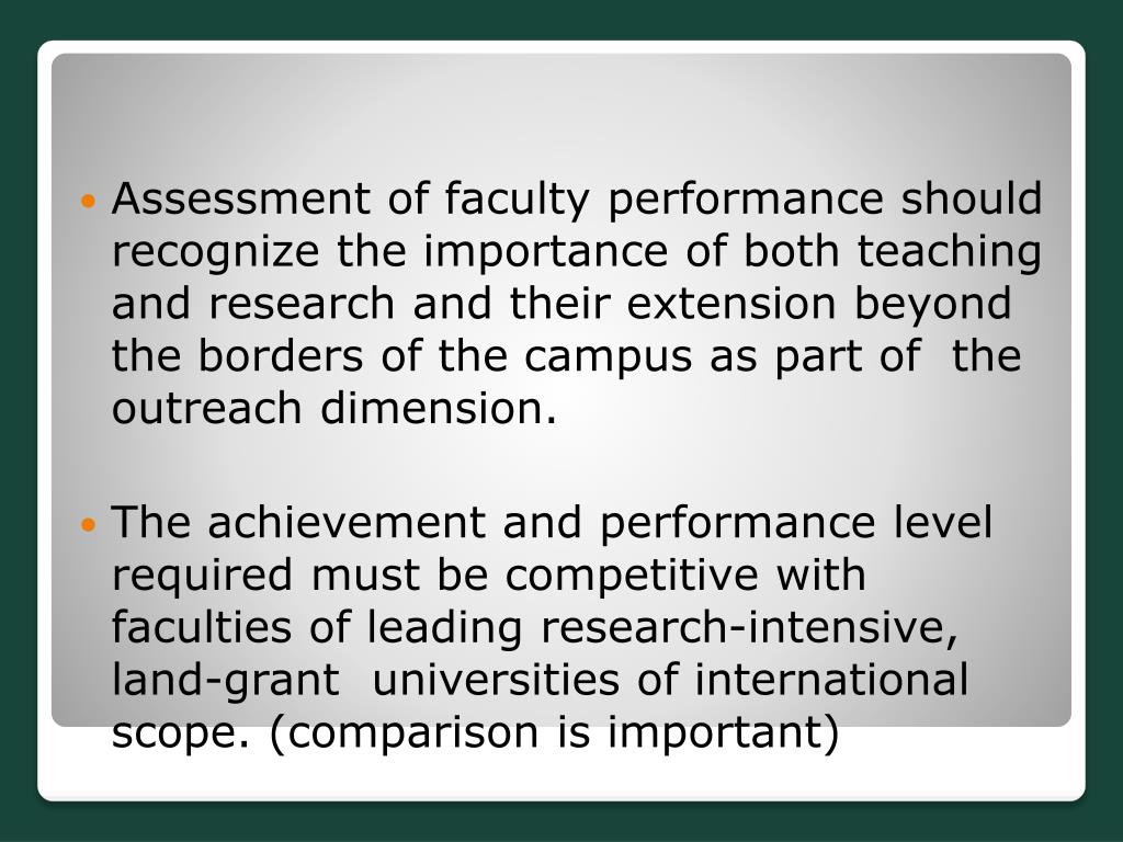 Assessment of faculty performance should recognize the importance of both teaching and research and their extension beyond the borders of the campus as part of the outreach dimension. • The achievement and performance level required must be competitive with faculties of leading research-intensive, land-grant universities of international scope. (comparison is important)