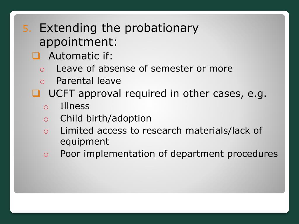Extending the probationary appointment: • Automatic if: • Leave of absense of semester or more • Parental leave • UCFT approval required in other cases, e.g. • Illness • Child birth/adoption • Limited access to research materials/lack of equipment • Poor implementation of department procedures