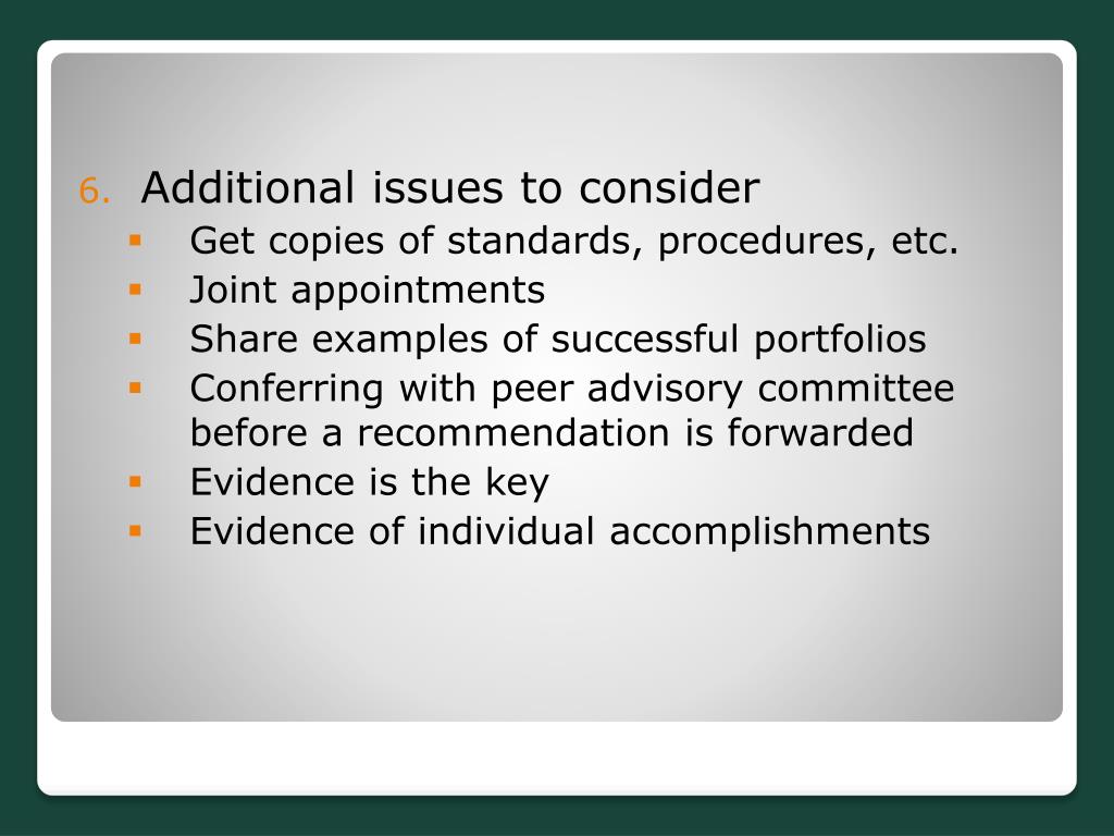 Additional issues to consider • Get copies of standards, procedures, etc. • Joint appointments • Share examples of successful portfolios • Conferring with peer advisory committee before a recommendation is forwarded • Evidence is the key • Evidence of individual accomplishments