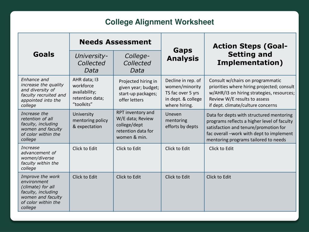 College Alignment Worksheet AHR data; I3 workforce availability; retention data; “toolkits” Decline in rep. of women/minority TS fac over 5 yrs in dept. & college where hiring. Consult w/chairs on programmatic priorities where hiring projected; consult w/AHR/I3 on hiring strategies, resources; Review W/E results to assess if dept. climate/culture concerns Projected hiring in given year; budget; start-up packages; offer letters RPT inventory and W/E data; Review college/dept retention data for women & min. University mentoring policy & expectation Uneven mentoring efforts by depts Data for depts with structured mentoring programs reflects a higher level of faculty satisfaction and tenure/promotion for fac overall –work with dept to implement mentoring programs tailored to needs Click to Edit Click to Edit Click to Edit Click to Edit Click to Edit Click to Edit Click to Edit Click to Edit