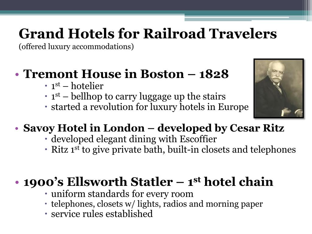 Grand Hotels for Railroad Travelers (offered luxury accommodations) • Tremont House in Boston – 1828 • 1st – hotelier • 1st – bellhop to carry luggage up the stairs • started a revolution for luxury hotels in Europe • Savoy Hotel in London – developed by Cesar Ritz • developed elegant dining with Escoffier • Ritz 1st to give private bath, built-in closets and telephones • 1900’s Ellsworth Statler – 1st hotel chain • uniform standards for every room • telephones, closets w/ lights, radios and morning paper • service rules established