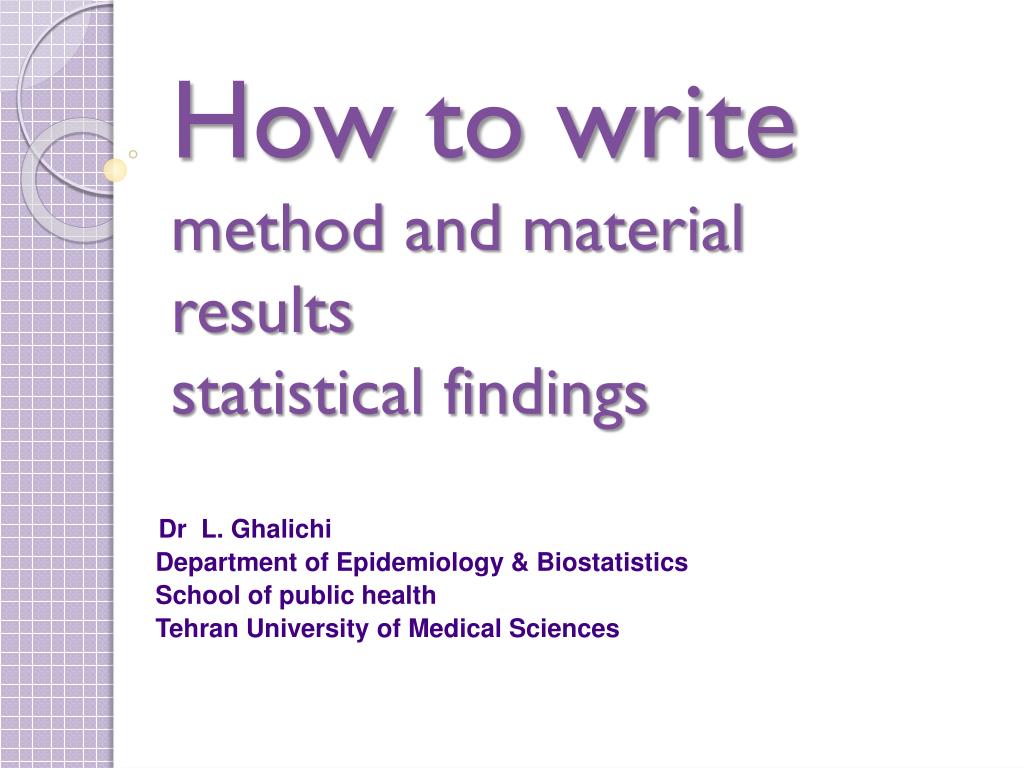 How to writemethod and materialresultsstatistical findings Dr L. Ghalichi Department of Epidemiology & Biostatistics School of public health Tehran University of Medical Sciences