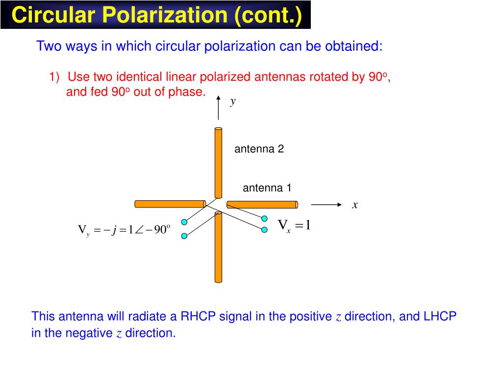 Circular Polarization (cont.) y antenna 2 antenna 1 x Two ways in which circular polarization can be obtained: • Use two identical linear polarized antennas rotated by 90o, • and fed 90o out of phase. This antenna will radiate a RHCP signal in the positive z direction, and LHCP in the negative z direction.