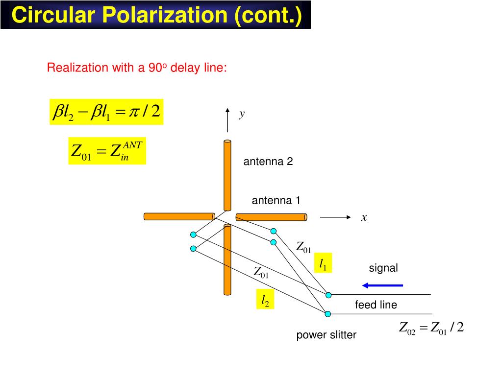 Circular Polarization (cont.) y antenna 2 antenna 1 x Z01 l1 signal Z01 l2 feed line power slitter Realization with a 90o delay line:
